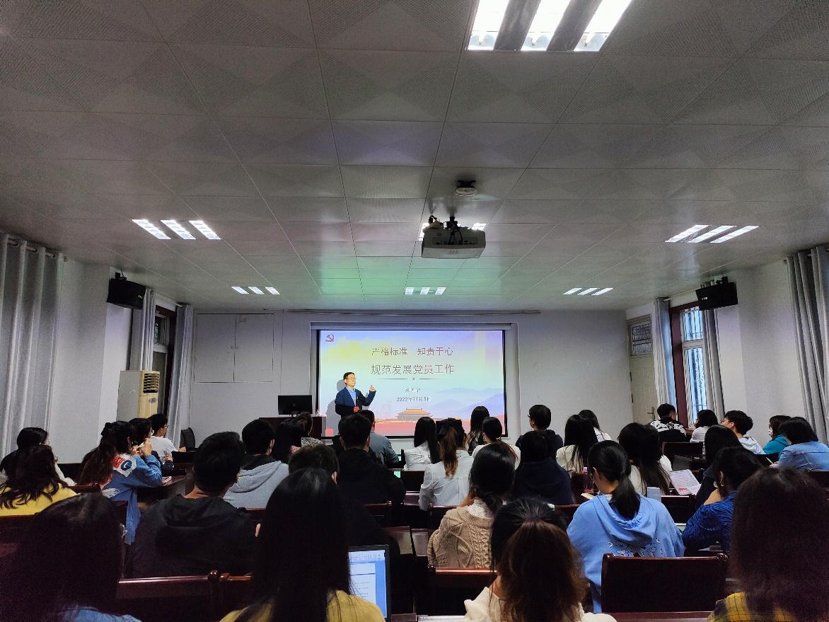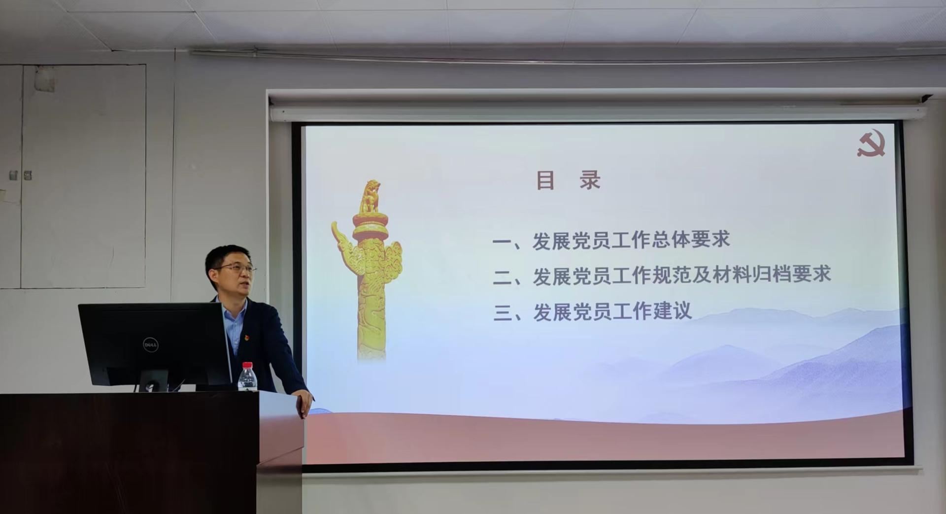 刘国华老师首先领学了党的二十大报告中有关党的建设的重要论述,并解读了党章修改内容。接着肯定了公管院员工党建工作具备扎实的工作基础,指出今年公司入选“全国党建工作示范高校”培育创建单位,对基层党建工作提出了更高质量的要求。随后以《严格标准,知责于心,规范发展党员工作》为题,讲述了发展党员工作总体要求和工作规范,强调规范发展党员程序、确保党员档案的完整性和真实性是基础性工作;并结合公司党员发展工作实际,分析了各公司党员发展过程中存在的共性和个性问题,提出公司党建工作要做好顶层设计、支委会要做好责任分工、发展过程要紧抓预审环节,多方合力共同做好党员发展工作。最后以党的二十大报告中习近平总书记对青年的寄语勉励青年党员要坚定信仰、敢于担当、勇毅勤奋、主动作为,将青春奉献到党和人民的事业中。