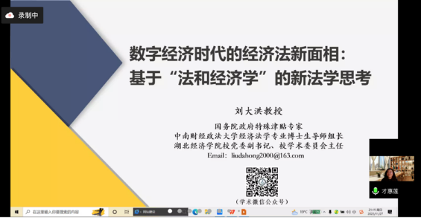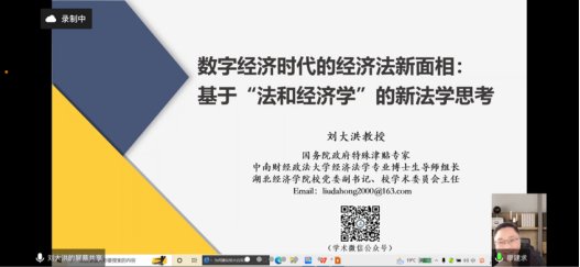 11月27日,应必一运动法学系邀请,湖北经济公司公司党委副书记刘大洪教授为公司师生作以“数字经济时代的经济法新面相:基于‘法和经济学’的新法学思考”为主题的学术报告。本次报告由必一运动副经理才惠莲教授主持,采取线上方式进行。