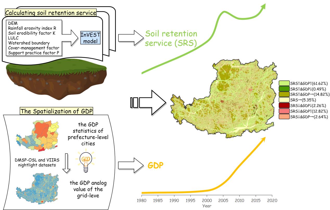 作者采用InVEST模型的沉积物保持模块量化了1980—2018年黄土高原地区的土壤保持服务,同时基于DMSP_OLS和VIIRS同化集成的夜间灯光数据集对该地区市级尺度的GDP统计数据进行空间化,并采用最小二乘法探究了黄土高原土壤保持量与GDP在空间上的变化趋势,最后采用空间叠加的方法,对两者在空间上的消长关系进行了分析。重点探究了实施退耕还林还草工程前后土壤保持服务和地区经济发展在空间上的变化趋势,为决策者制定区域可持续发展规划提供科学参考依据。