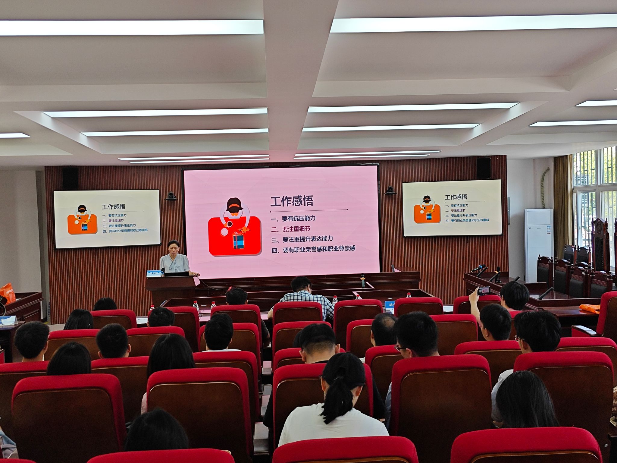 在交流环节,同学们从专业学习、生涯规划和成长建议等方面进行了提问,黄文娟员工一一给予了解答。“我觉得法官这份职业,很琐碎,很需要耐心。但是也很闪光,也很伟大!”,她勉励同学们要将工作岗位和个人兴趣爱好相结合,在工作中要有抗压能力,要注重细节,要注重提升表达能力,要有职业荣誉感和职业尊崇感,真正在工作中实现自己的人生价值和理想。