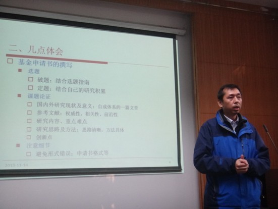 刘江宜副教授在会上对国家社科基金的性质、选题、破题以及申请书的撰写和流程做了详细介绍,并结合自身国家社科基金的申请经验与参会青年教师进行了交流。随后,公司才惠莲副经理就社科基金申请书应把握的方向、书写技巧等问题与青年教师进行了深入交谈。会上,李世祥、王忠等老师也对自己的基金申请经验进行了说明,与会老师积极参与交流,同时吸引了部分外院的青年教师参加,会议气氛活跃。
