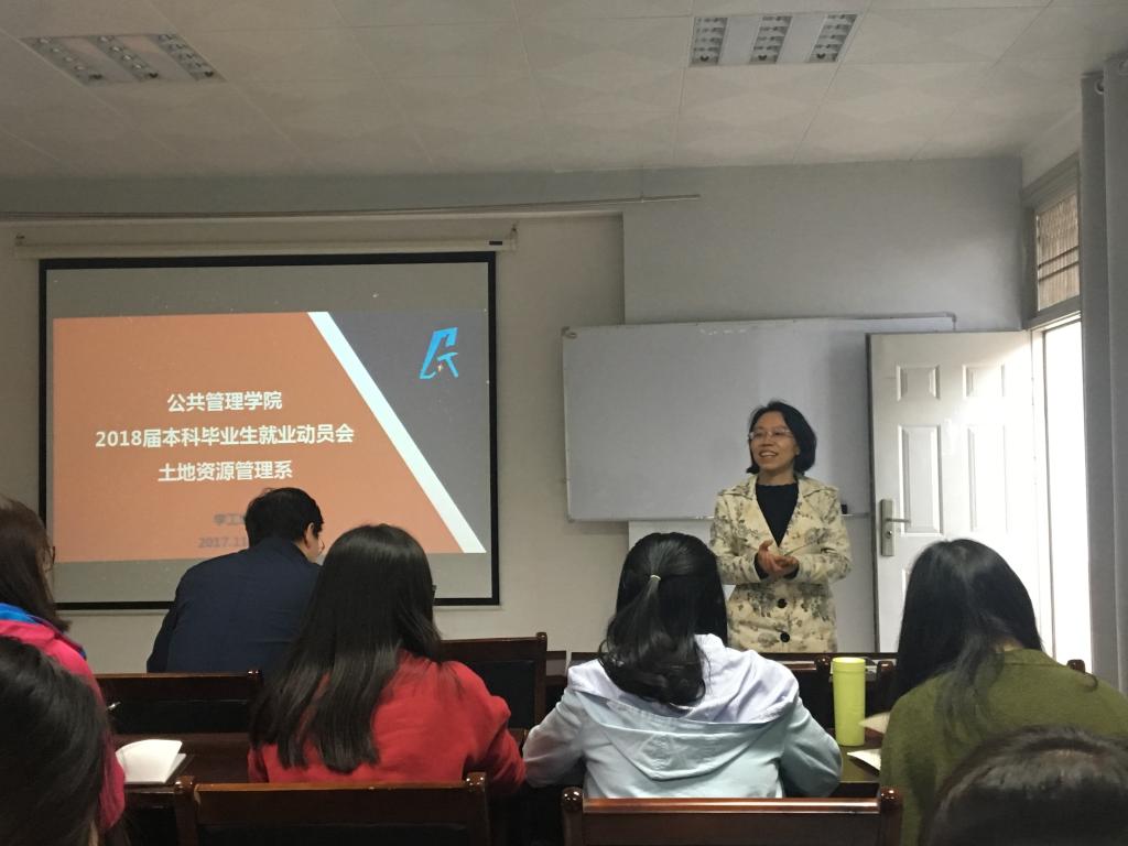 胡文勤书记主持开场之后,李姝慧老师通过PPT演示为土地资源管理专业的同学们进行就业指导和动员,分析了往届同学就业升学情况、目前就业形势以及同学们就业升学可能面临的问题。她建议想要考研和考公务员的同学多关注相关讯息,把握好时间,也可以参加招聘会做两手准备;同时也给找工作的同学分享了经验,梳理了后期的大型招聘会信息,并重点介绍于11月4号开展的大型校园招聘会,号召大家积极参与。李姝慧老师讲解完毕后胡文勤书记也指出同学们对于之前的校园招聘会参与度不高,希望同学们予以高度重视,把握机会多尝试。