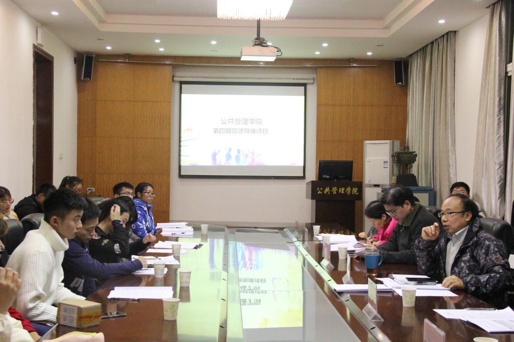 12月13日晚六点半,2017年必一运动第四期院领导接待日在公管楼B209成功举行。出席本次会议的领导有公共管理公司党委书记张吉军老师、党委副书记胡文勤老师、法学系副主任吕凌燕老师、公共行政系副主任刘中兰老师、区域规划与信息技术系主任刘超老师、土地资源管理系主任朱江洪老师、团委副书记李姝慧老师。本次会议主要围绕解决公司员工在老员工活中遇到的各种问题,发现并解决公司建设中存在的问题与不足来展开。