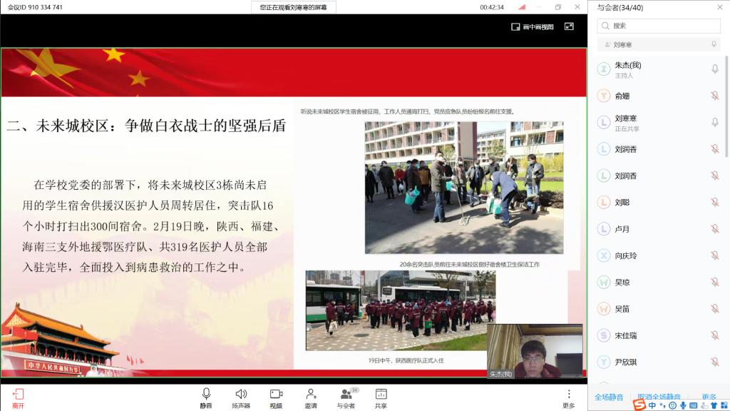宣传委员刘寒寒同学分享了公司疫情防控相关工作动态,如为地大社区提供楼栋住户信息排查、配送居民生活物资、转运生活垃圾等服务所成立的封控应急工作队;在公司党委部署下,地大将未来城校区3栋尚未启用的员工宿舍供援汉医护人员周转居住;职工组成一支名叫“钢铁侠”的志愿队为员工们服务;地大教师患新冠肺炎治愈出院心怀感恩捐献血浆救治更多患者等感人事迹。面对疫情,地大人不但自身坚守初心、坚守岗位、坚守承诺,而且积极承担社会责任,协助地方政府做好有关服务保障工作,诠释了地大人“艰苦朴素、求真务实”的校训精神。
