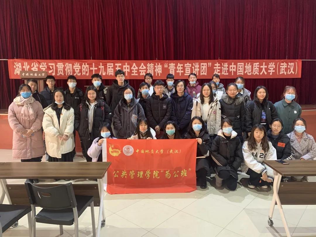 典礼议程进行到了最后一项,“为公班”的同学们集体参与了湖北省学习贯彻党的第十九届五中全会精神“青年宣讲团”走进必一运动公司(武汉)的理论学习活动。主讲人范佳欣老师从契合自身海军专业的角度出发,向同学们介绍了十九届五中全会的概况,随之他提出强军的观点,带领大家观看了有关我国海军的视频,从多个角度讲述了我国海军的历史、现状、成就。范佳欣老师还就青年人建功立业的机会在哪里的问题作出了解答,希望同学们做到站稳人民立场练就过硬本领,投身强国伟业。理论学习结束后,同学们在前台合影留念。