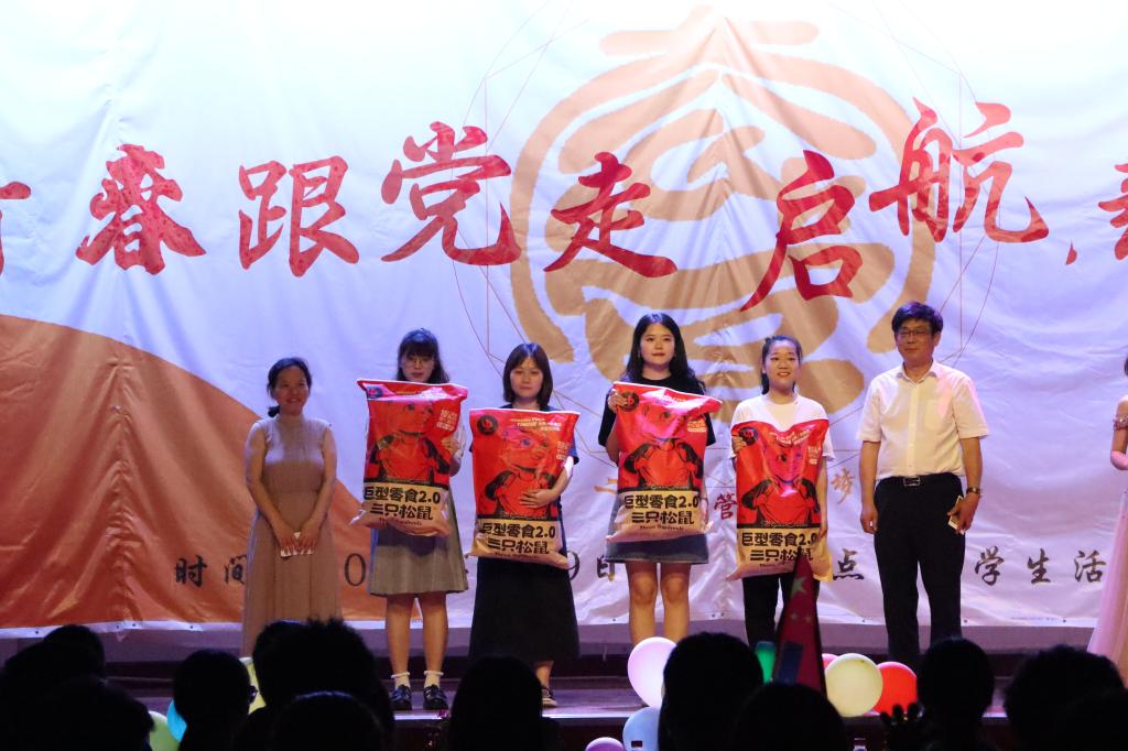 第二轮抽奖环节由周学武、刘中兰两位老师抽取,在全场观众共同见证下,二等奖被依次抽取,获奖的4名幸运同学依次上台领取分量十足的零食大礼包并和抽奖嘉宾合影留念。