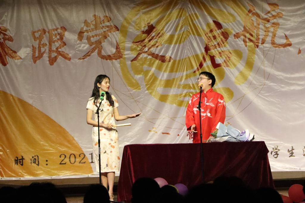 171171班朱悦和金玉林为我们带来了相声《我的朋友叫张三》。内容活泼有趣,欢快轻松的表演引来台下观众阵阵欢笑。