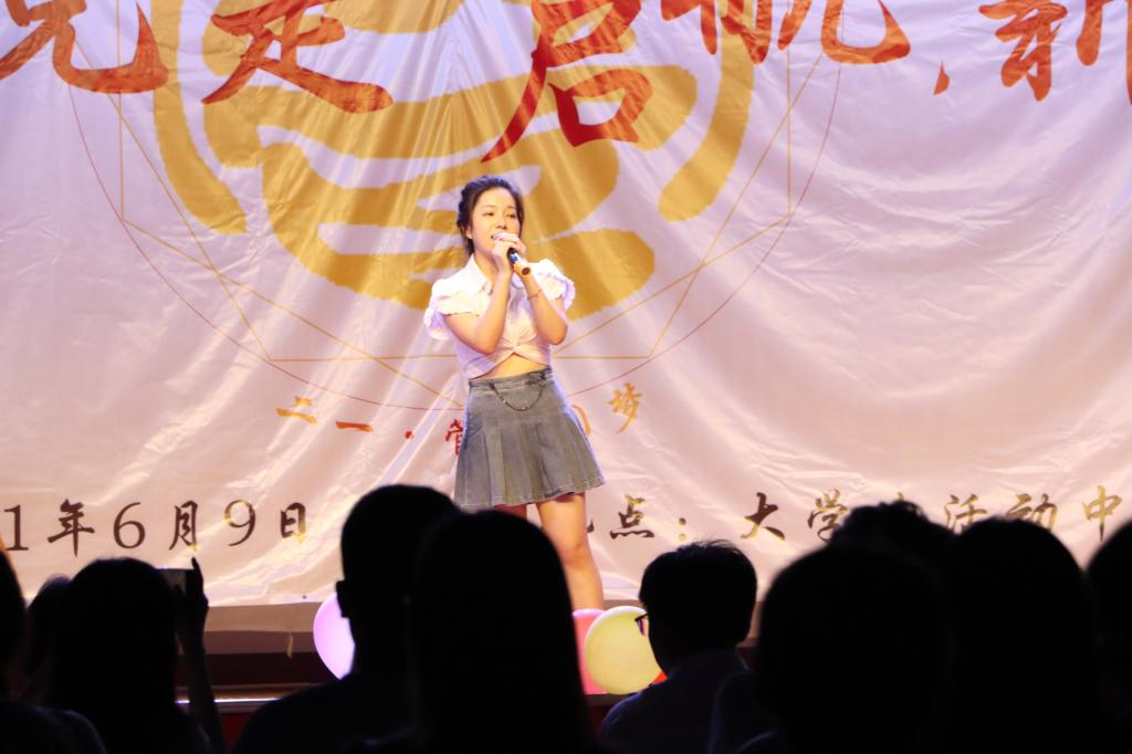 之后,毕业年级辅导员吴波、王青涛、周佳仪及辅导员王欣雨、李文伟为大家带来特别节目——歌曲《当》。老师们深情的演唱带动了全场氛围,在荧光棒和手拍构成的欢乐海洋里,气氛达到高潮。