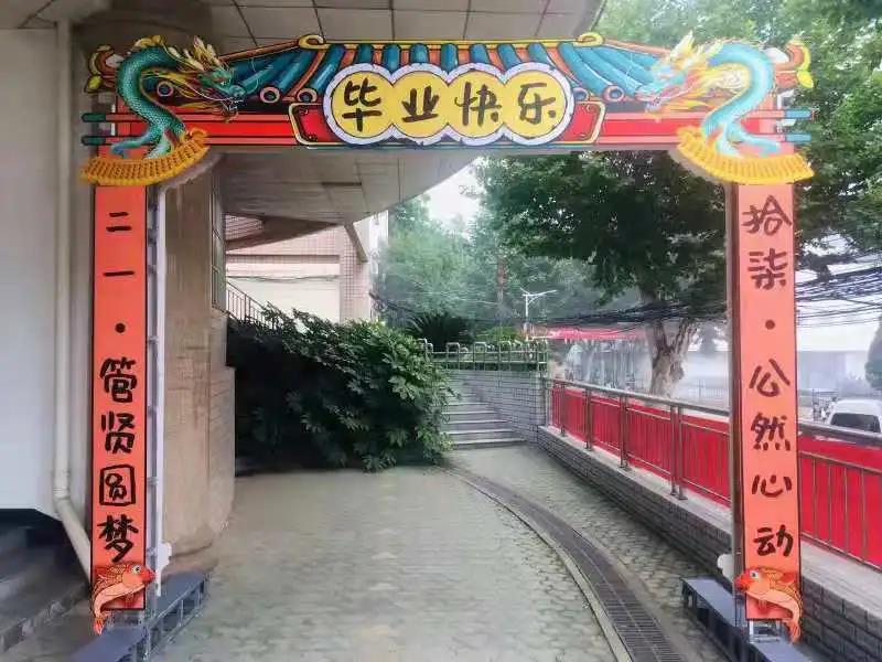 过花门,走红毯,会场外的布置为毕业生们增添了色彩。同学们走进会场,都不约而同的走向签名墙,签上自己的名字并与同学合影留念。