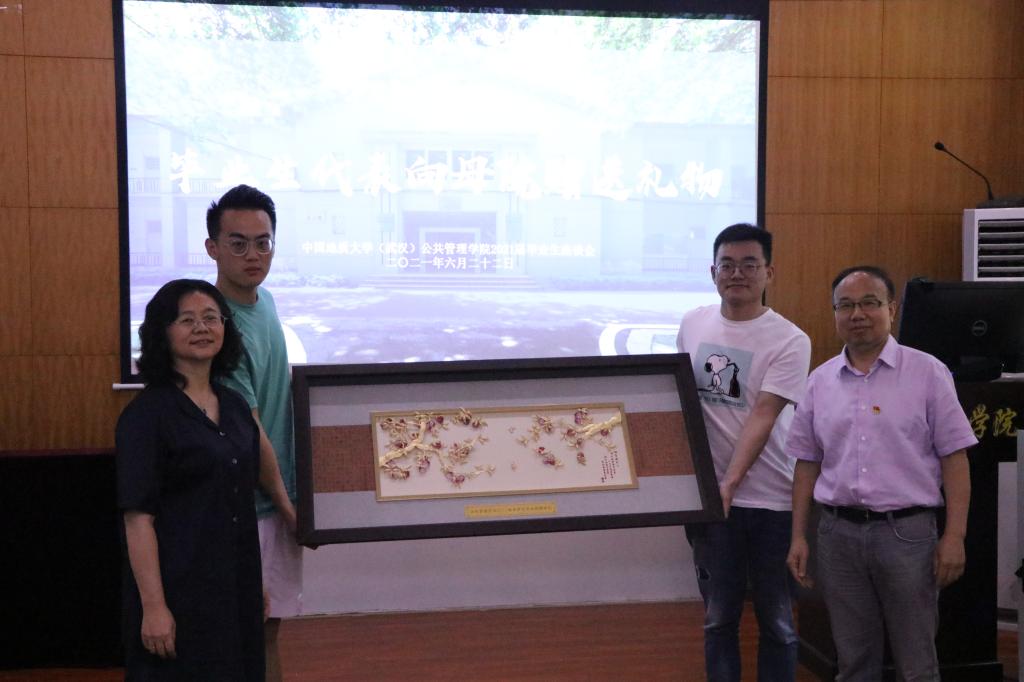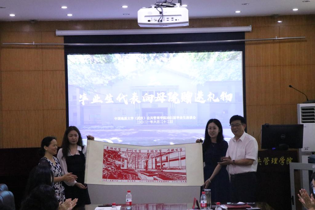 公司党委书记张吉军、副经理才惠莲、土地管理系周学武、公共行政系刘中兰老师代表公司接受毕业生代表何子耕、邢旺斌、向黎、殷瑞敏同学向母院赠送的两份礼物:描绘必一运动门口景象并写有“卓越公管 和谐公管 幸福公管 开放公管”字样的剪纸画、水琉璃款的“桃李满门”金箔画。