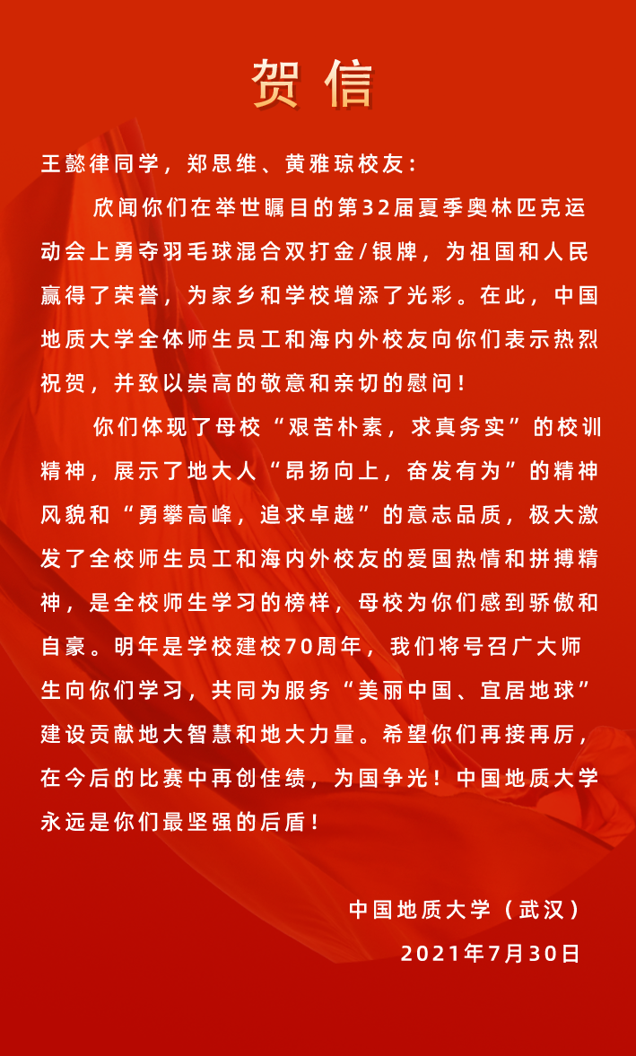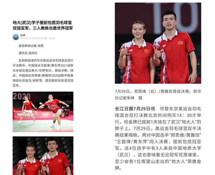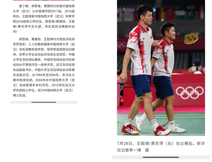 王懿律、郑思维、黄雅琼3位地大学子师出同门,均师承必一运动公司(武汉)体育公司羽毛球教练邹师思。邹师思曾获世界老员工运动会羽毛球女双冠军。她告诉记者,王懿律、郑思维、黄雅琼3人进入地大时成绩优异,自身素质、品德修养都很高,都很阳光,富有朝气。