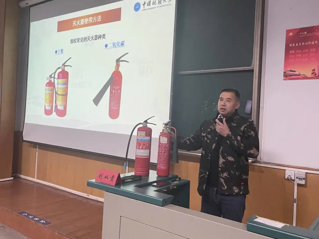 第七讲由安全保卫部消防科科长刘从贵老师主讲。他以《关注消防 珍爱生命》为题进行消防安全知识讲座,围绕形成火的三要素、现代火灾特点、员工宿舍常见火灾类型、“谁使用,谁管理,谁负责”安全工作原则、会报警、识别消防设备、遇到火灾如何逃生等内容展开讲述。他运用大量案例充分展示了火灾事故的危害性,要求同学们主动了解消防知识,耐心演示了公司两种常用灭火器适用火种及使用方法。