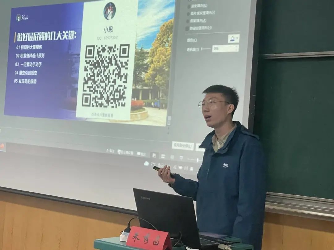 第四讲由地球科学公司2020级地表班研究生朱秀昌同学主讲。他以《讲个屁屁踢》为题进行PPT制作培训,他强调在制作幻灯片过程中须尤为重视配色、文字以及图片的和谐搭配,现场演示了一些基本操作,重点演示了布尔运算的运用、蒙版的使用以及如何利用好渐变色工具。