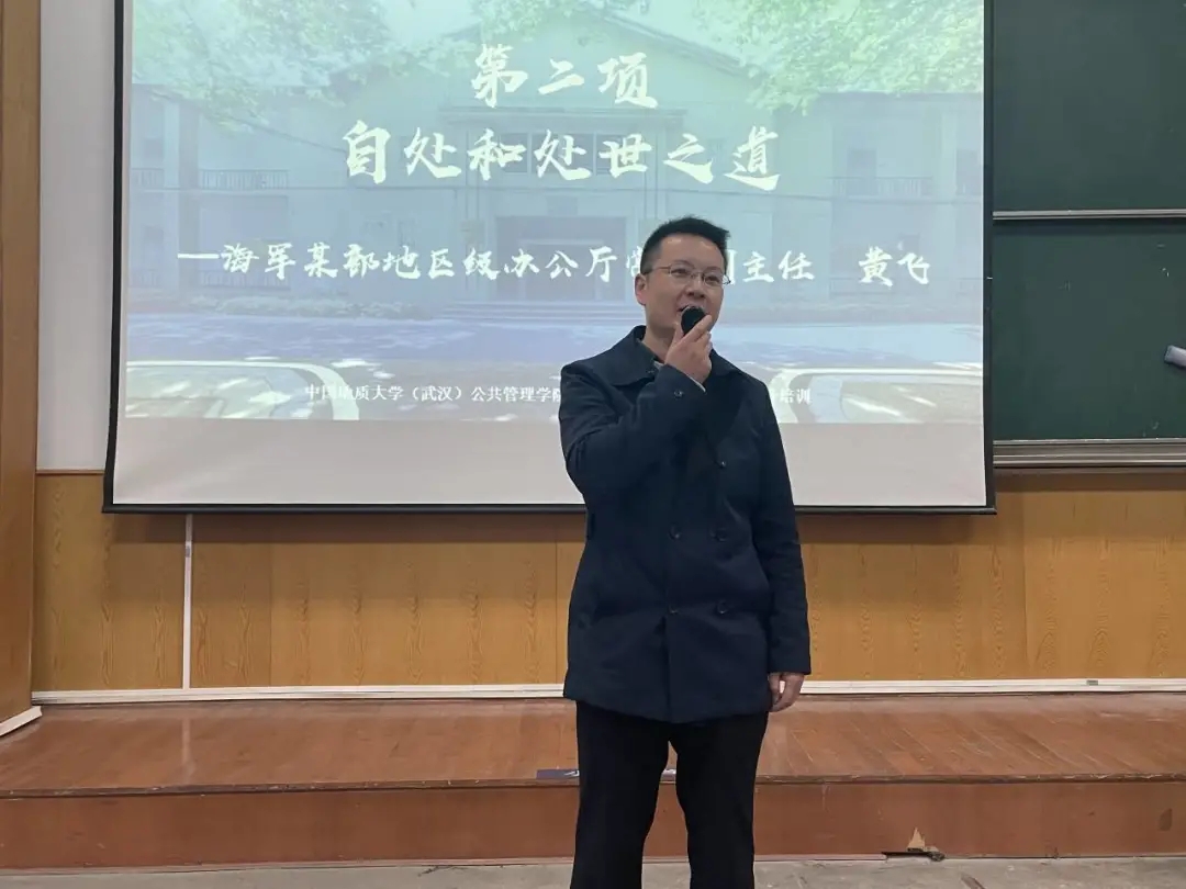 第二讲由海军某部地区级办公厅常务副主任黄飞主讲。他以《如何自处和处世》为题对自己学习、工作进行了简要讲述,结合自己的成长发展经历概括出自处和处世之道并分享给同学们。黄飞主任还在就业、沟通技巧、如何考取军队文职人员等问题为同学们现场答疑解惑。