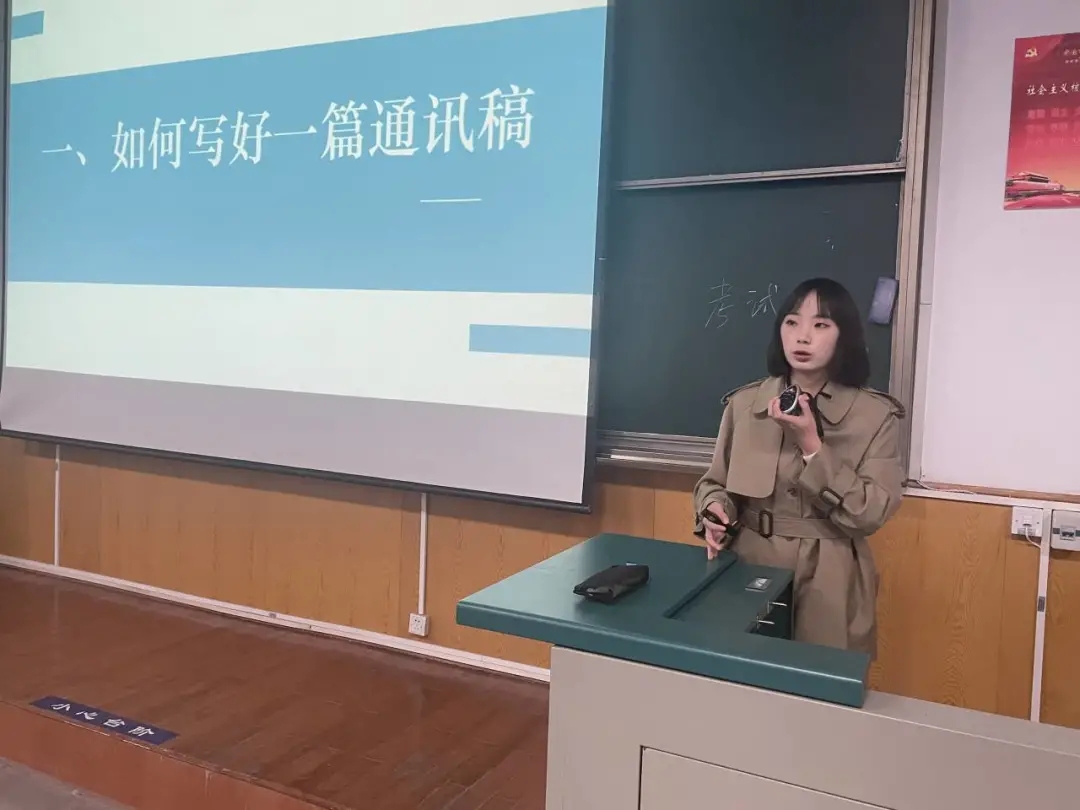 第六讲由原校社团联合会主席、公司公共事业管理专业173182班韦仕莉同学主讲。她以《通讯稿撰写与人物采访》为题,就如何写好一篇通讯稿、如何做好人物采访谈了自己的实践和心得体会,分享了自己在在《中国青年报》发表的3篇推文。她重点谈了通讯稿写作结构、写作要点、注意事项、案例分析,任务采访的前期准备、采访过程、采访观察、稿件写作等主要内容,她认为好的新闻人需要不断阅读、思考、借鉴、提升,好的新闻稿件需数次修改,只有多看、多思考、多借鉴、多写才能写出高质量的文稿。