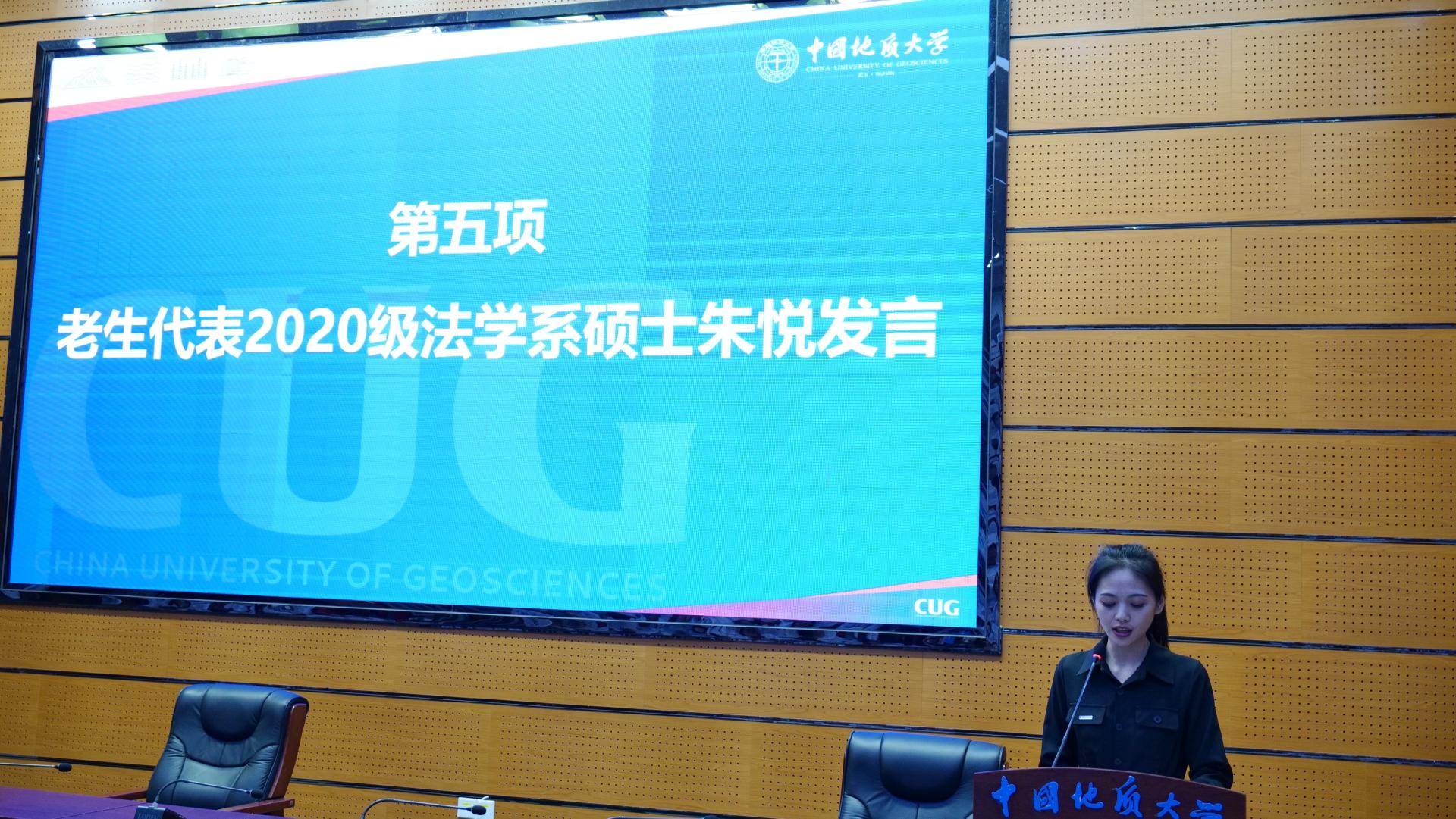 法学系2020级硕士生,2023年校研究生标兵获得者朱悦作为老生代表发言。她结合自身在地大、在公司的成长故事,从“定位”、“突破”和“担当”三方面希望同学们能够充分把握公司和公司提供的资源平台,找准自身定位,勇于创新突破,矢志担当作为,全力“跑”出新时代公管人的“加速度”。