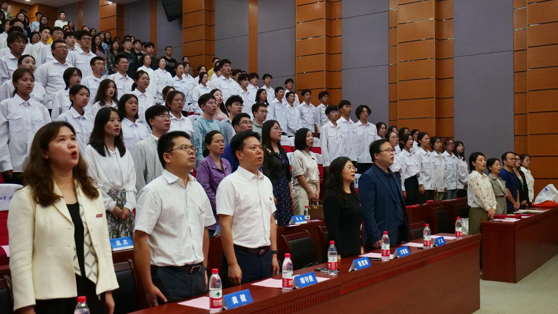 新生开学典礼在庄严国歌声中拉开帷幕。