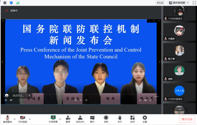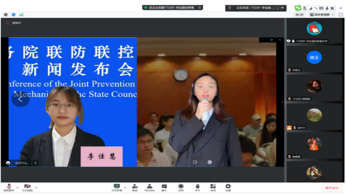 (通讯员 刘中兰 鲍媛媛)为激发公共行政系学子对新闻发言的兴趣,鼓励员工关注时事热点,培养员工综合实践能力,凸显公共行政系专业培养方案特色,12月23日,公共行政系172201、172202、173201、173202班全体员工开展了模拟新闻发言人实训活动。因疫情防控需要,采用腾讯会议线上组织进行。本次《模拟新闻发言人》课程实践训练活动由刘中兰老师组织和主持,参加的评委老师有卓成刚教授、罗辉教授、李晓玉副教授、刘中兰副教授和黄砺副教授。